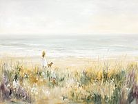 Dit hartverwarmende aquarel-kunstwerk, Zomerlicht en de Teckelvoetjes aan Zee, vangt het perfecte moment: een meisje in een lichte jurk en haar kleine teckel lopen hand-in-pootje door wuivend duingras vol wilde bloemen, met een eindeloze, zonovergoten zee op de achtergrond.