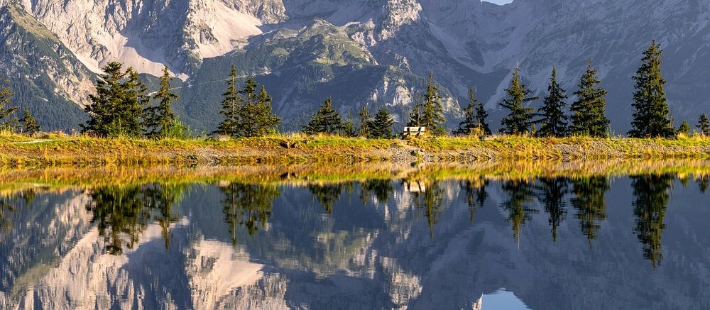 De Wilder Kaiser en het Kaisergebergte worden weerspiegeld in de Astbergsee boven Going in de Tiroler Alpen. De regio is vooral bekend van de serie Bergdoktor op de Duitse televisie.