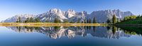 Het Kaisergebergte (bekend van de tv-serie The Mountain Doctor) wordt weerspiegeld in het idyllische bergmeer op een heldere zomerochtend in de Tiroler Alpen.