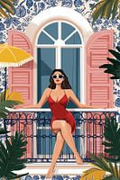 Deze afbeelding toont een sensuele, zelfverzekerde vrouw met haar rode jurk en witte zonnebril op een balkon, omringd door prachtige architectuur, bloemen en tropische vegetatie. De warme kleuren en de uitnodigende sfeer creëren een romantische en zorgeloze vakantiestemming.