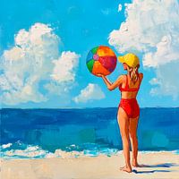 Een harmonieus samenspel van heldere blauwe en warme gele tinten is een teken van zomerse vreugde. Een vrolijk kind in rode zwemkleding staat op het strand, klaar om de kleurrijke bal in het water te gooien. De zachte golven op de achtergrond en de pluizige wolken geven het tafereel een zorgeloze, dromerige sfeer.