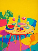 Een zomerse tafelscène barst van de energie, met felle kleuren, fruitige lekkernijen en verfrissende drankjes in het warme zonlicht. De strakke compositie en minimalistische vormen geven het geheel een moderne, speelse uitstraling. Dit digitale kunstwerk ademt vakantiegevoel en is een instant oppepper voor elke ruimte.