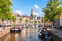 Uitzicht op de monumentale panden aan het Hoge der A in de binnenstad van Groningen tijdens een zomerse dag. Op de achtergrond is de kerktoren van de Der Aa-kerk nog zichtbaar. De foto is genomen vanaf de Vissersbrug.