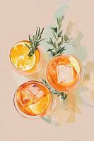 Een digitale illustratie van drie verfrissende cocktails in zachte, warme tinten. De compositie toont een bovenaanzicht van glazen gevuld met een oranje aperitief, versierd met ijsblokjes, schijfjes sinaasappel en verse rozemarijn. De zachte, waterverf-achtige achtergrond in beige en mintgroene tinten geeft het geheel een moderne,…