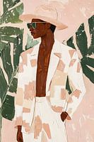 Figuur in een licht, abstract patroon van beige en roze kleding, gecombineerd met een hoed en een zonnebril. De figuur straalt zelfverzekerdheid en een gevoel voor mode uit, met een ontspannen houding waarbij één hand in de zak is gestoken. De donkere huidtint van de figuur contrasteert prachtig met de lichte kleuren van de kleding en…