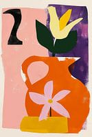 De afbeelding is gecentreerd rond een vaas met een uitgesproken oranje tint, die direct de aandacht trekt en het midden van het stuk domineert. Een grote, gestileerde bloem rust tegen de vaas, met zachte perzikroze…
