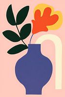 Een centrale, indigo blauwe vaas vangt de blik, met zijn klassieke vorm die rust en traditie uitstraalt. Uit deze vaas ontspringt een plant met diepgroene bladeren, wat een organisch element toevoegt aan de compositie. De plant wordt bekroond met een bloem in levendige rood- en geeltinten, die een warm en zonnig gevoel oproepen.