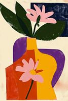 Het gebruik van heldere en gedempte kleuren naast elkaar geeft het werk een dynamische maar gebalanceerde uitstraling. De illustratieve stijl en het beperkte detail van de bloem en bladeren zorgen voor een moderne en gestileerde interpretatie van de natuur.