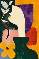 Onder het profiel bevindt zich een gestileerde gele bloem die een levendige toets aan de compositie toevoegt. De achtergrond is een patchwork van kleuren, met diepe purperen, zachte roze tinten, en robuuste oranje en gele vlakken, die samen een achtergrond vormen die zowel dynamisch als bedachtzaam is. De textuur van de penseelstreken voegt een ruw, handgemaakt gevoel toe dat het geheel een extra dimensie van diepte en interesse verleent.