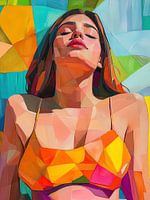 "Dit kunstwerk toont een vrouw met gesloten ogen en het hoofd licht achterover gekanteld. Haar gezichtsuitdrukking straalt ontspanning en overgave uit. De vorm van haar gezicht en bovenlichaam is opgebouwd uit strakke geometrische vlakken, die aanvoelen als een digitale collage of een geschilderd mozaïek. De achtergrond bestaat uit vlakken in verschillende richtingen, waardoor beweging en diepte ontstaan.