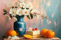 Een sfeervol stilleven waarin een turquoise vaas met witte bloesems centraal staat tegen een zachte pastelkleurige achtergrond. De compositie wordt verrijkt door sappige sinaasappels en een verleidelijk taartje, rustend op een houten tafel. De warme en koele kleurtonen creëren samen een harmonieuze balans, terwijl de losse…