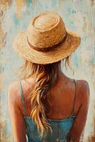 Een zonnestraal danst op het eenvoudige blauwe topje, terwijl de strooien hoed zachtjes wiegt in de wind. Het lange, nonchalante haar valt speels over de schouders en geeft het tafereel een zielvolle lichtheid. De ingetogen pose nodigt uit tot dromen, terwijl de zachte kleuren een nostalgische zomerstemming oproepen.