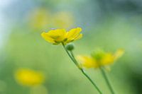 Een close-up van boterbloemen in een veldje. Deze bloemen zijn eigenlijk wat ondergewaardeerd, want kijk eens hoe deze een mooi en vrolijk beeld opleveren. Ook zie je net nog een stukje van een vleugel van een insect boven de bloem uitsteken.