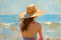 Door het zachte spel van kleuren en licht geeft de scène een gevoel van rust en zomer. Een persoon, gehuld in een lichte jurk en beschermd door een strooien hoed, geniet van het uitzicht op de glinsterende zee. De golven dansen zachtjes op de kust en nodigen de kijker uit om te ontspannen, terwijl de wind zachtjes door het haar van de…