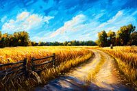 Dit prachtige ontwerp toont een zonovergoten tarweveld dat zich uitstrekt tot aan de horizon, met een kronkelend pad dat uitnodigt om het landschap te verkennen. De warme gele tinten van het graan contrasteren prachtig met de levendige blauwe lucht, terwijl de groene bomen op de achtergrond diepte toevoegen aan het geheel. Dit schilderij brengt een gevoel van rust en natuurlijke schoonheid in elke ruimte en is perfect voor liefhebbers van serene en landelijke taferelen. Een sfeervol kunstwerk dat elke muur tot leven brengt en een vleugje zomer in huis haalt.