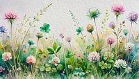 Stap binnen in een betoverend zomers bloemenveld vol kleur en rust. Dit prachtige kunstwerk in natuurlijke aquarelstijl vangt de essentie van een zomerse weide vol wilde bloemen, klavertjes en sierlijke grassen. De zachte pasteltinten van roze, lavendel, wit en groen brengen een gevoel van vrijheid, frisheid en elegantie in elke ruimte.