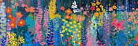 Dit werk brengt een zomerse bloementuin tot leven, waarbij het laatste licht van de dag zich mengt met een scala aan bloeiende schoonheden. Oranje en rode tinten floreren naast hemelsblauw en roze, terwijl delicate witte bloesems het beeld van een rustgevende zonsondergang compleet maken. Het is een stuk dat de ziel van een warme zomeravond uitstraalt, perfect voor wie de levendige energie van de natuur in huis wil halen. De afbeelding biedt een verfrissende kijk op de traditionele bloemenschilderkunst, en zou een prachtige aanvulling zijn op elke muur die wat kleur kan gebruiken.