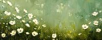 Dit schilderij toont een uitgestrekt veld met delicate witte bloemen, waarschijnlijk anemonen, die zich uitstrekken tegen een achtergrond van zachte groen- en blauwtinten. De bloemen lijken te dansen in een zachte bries, wat wordt gesuggereerd door de vloeiende penseelstreken en de levendige texturen. De achtergrond is een harmonieuze…