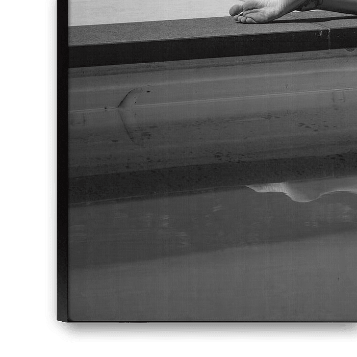 De afwezigheid van kleur versterkt het gevoel van tijdloze rust en richt de aandacht op de grafische elementen van het beeld: het silhouet, de reflectie van het licht op het wateroppervlak, en de horizontale lijnen van de zwembadrand. Dit is een prachtig voorbeeld van minimalistische figuratieve fotografie en moderne elegantie.