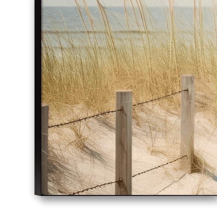 Het pad is afgebakend door houten palen en verweerd touw, die een gids vormen voor bezoekers naar de waterkant. Het helmgras buigt zacht in de zeewind, toevoegend aan de dynamische natuur van de kust. Het fijne zand van het pad is ongerept, met slechts enkele voetstappen die de aanwezigheid van mensen suggereren. De zee is rustig met subtiele golven die het zonlicht reflecteren, terwijl de hemel een canvas van blauw en wit toont. De compositie van de afbeelding brengt een gevoel van verwachting en avontuur, terwijl het tegelijkertijd een vredige en kalmerende uitstraling heeft.