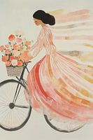 Een meisje in een vrolijke, roze, geel, rood, wit gestreepte jurk trapt rustig op haar zwarte fiets over een zacht grasveld. In de mand van haar fiets staan kleurrijke bloemen – felroze, geel en dieprood – die vrolijk meebewegen met elke traptred. De lucht is zacht wit, alsof de zon een warme gloed over de dag legt, en het fietsmandje is bezaaid met bloemen die in het lentezonnetje bloeien.