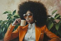 In deze levendige afbeelding zien we een vrouw die met haar krachtige uitstraling en modekeuze de essentie van zomerse flair belichaamt. Haar afro-kapsel is vol en speels, wat haar unieke schoonheid accentueert. Ze drinkt met zichtbaar plezier een kop koffie, wat niet alleen een moment van ontspanning symboliseert, maar ook haar liefde voor de kleine geneugten in het leven.