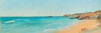 'Zomerse Kustbries' brengt een verfrissend beeld van een zonnige stranddag met uitzicht op rustige, turkooizen golven die zachtjes tegen een gouden kustlijn kabbelen. De pastelkleurige hemel boven de uitnodigende zee weerspiegelt een gevoel van zorgeloze sereniteit en tijdloze charme.