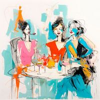 Drie vriendinnen genieten van een gezellige borrel op een zomerse dag. Hun levendige gesprekken worden weergegeven door de expressieve penseelstreken en het heldere kleurenpalet. Ze lachen, proosten met hun glazen wijn en genieten van het samenzijn. Het kunstwerk straalt een zomerse vibe uit, vol warmte, vriendschap en ontspanning.