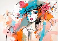 De krachtige expressie van deze vrouw getuigt van zelfvertrouwen en allure. Omgeven door felle kleuren, vormt ze het levendige middelpunt van een stedelijk avontuur, vastgelegd in gewaagde en vrije penseelstreken.