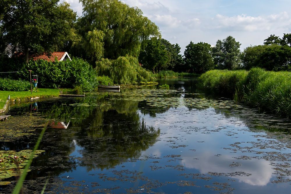 Deze sfeervolle zomerse foto is genomen in de groene omgeving van IJlst, Friesland. De rustige sloot met waterlelies en riet weerspiegelt een blauwe lucht met zachte wolken. Aan de linkerkant zijn charmante tuinen en houten steigers zichtbaar, terwijl het omliggende groen een gevoel van stilte en landelijke rust oproept. Een prachtig voorbeeld van het typisch Friese waterlandschap in harmonie met de natuur.