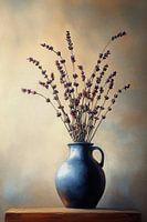 De delicate lavendeltakken lijken bijna te bewegen in een onzichtbare bries, terwijl hun levendige paarse tinten contrasteren met de koele blauwe vaas. Het warme, gouden licht dat de scène omhult, roept de sensatie op van een late zomermiddag in de Provence. De textuur van de ruwe houten plank en de gladde keramiek van de vaas nodigen uit tot aanraking. De kijker kan bijna de zoete, kruidige geur van verse lavendel waarnemen, die de lucht vult met een gevoel van kalmte en welzijn. Het subtiele spel van licht en schaduw op de achtergrond creëert diepte en dimensie, waardoor het oog wordt geleid naar de eenvoudige schoonheid van de compositie. Dit kunstwerk is een visuele symfonie die rust en contemplatie oproept, een moment van stilte vastgelegd in tijd en ruimte.