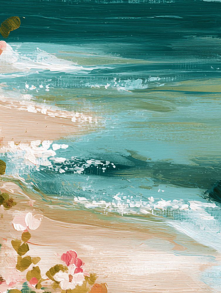Een dromerig kusttafereel met bloeiende bloemen op de voorgrond en de zee in de verte. De combinatie van beweging en rust maakt dit werk tijdloos en ontspannend. Perfect voor woon- of slaapkamer.
