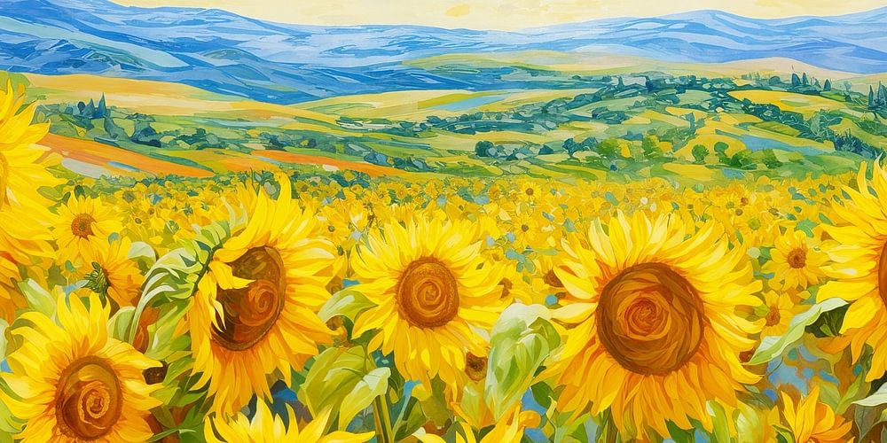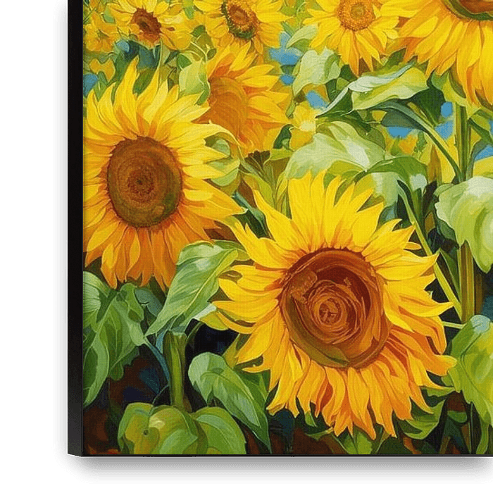 Een kleurrijk digitaal schilderij van zomerse zonnebloemen in zuid Frankrijk. Dit werk is geïnspireerd door de vormen en kleuren van de Franse zomer. Het werk geeft een dromerige en klassieke uitstraling aan uw interieur!