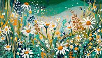 Een vrolijk zomers  schilderij met wilde bloemen zoals Margrieten tussen hoge grassen langs de kant van de weg.