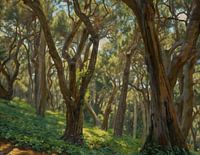 Centraal staan de majestueuze oerbomen, elk met een geschiedenis die honderden jaren teruggaat. Hun stammen zijn verweerd, stakig en krachtig – stille getuigen van de tijd. De met AI vervaardigde werk , vertrokken vanuit een van mijn eigen werken, heeft een verfijnde schilderstijl: elke penseelstreek getuigt van precisie, maar behoudt tegelijkertijd de frisse, directe energie van een alla prima werk. Dit zorgt voor een unieke textuur en diepte die het levende hout en het fonkelende bladerdak tot leven brengt.
