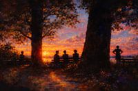Op deze zomeravond in het park hangt een sfeer van rust en verbondenheid. Tussen de hoge bomen verzamelen mensen zich aan het einde van de dag: ze zitten samen op een bankje, kijken uit over het landschap of staan even stil om te genieten van de ondergaande zon. Het warme avondlicht kleurt de lucht in tinten van oranje, roze en…
