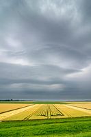 Zomerse onweersbui boven graanvelden in Flevoland met donkere wolken in de lucht en geel groene graanvelden.