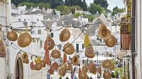Afbeelding van zomerse hoedjes in het straatbeeld van Alberobello in Puglia, Italië.