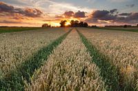 De zon gaat onder boven een boerderij aan de Vierburenweg bij Westeremden.