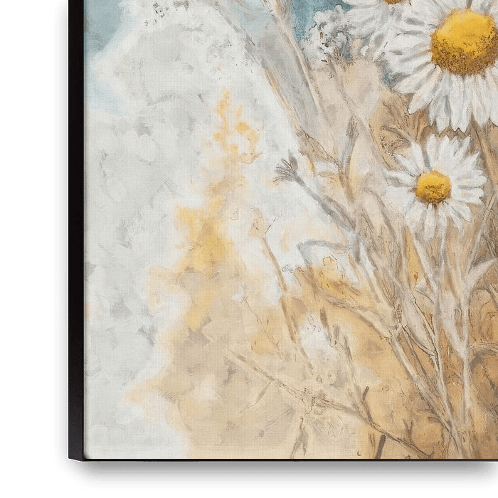 Een zomerse wandeling langs weelderige graslanden, waar wilde margrieten en wuivende pluimen je begroeten met hun eenvoudige charme. Dit werk vangt de sfeer van een rustige ochtend: een lichte bries, het zachte geluid van ritselend gras, en het geurige veld vol bloeiende bloemen. De kleuren van gebroken wit en warmgeel tegen een…