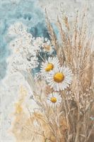 Een zomerse wandeling langs weelderige graslanden, waar wilde margrieten en wuivende pluimen je begroeten met hun eenvoudige charme. Dit werk vangt de sfeer van een rustige ochtend: een lichte bries, het zachte geluid van ritselend gras, en het geurige veld vol bloeiende bloemen. De kleuren van gebroken wit en warmgeel tegen een koelblauwe achtergrond brengen een gevoel van frisheid en eenvoud. Perfect voor wie houdt van natuurlijke schoonheid zonder opsmuk.
