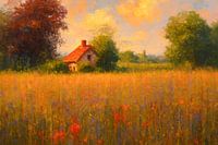 Dit impressionistische olieverfschilderij is door mij gecreëerd op basis van een zelfgemaakte foto die ik nam tijdens een zomerse wandeling door een landelijk landschap in Frankrijk. Het oorspronkelijke beeld – een klein, karaktervol huisje met rood dak dat verscholen ligt tussen hoge bomen en omringd wordt door een uitgestrekte bloemenweide – vormde de inspiratie voor dit digitale kunstwerk.