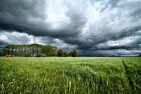 Donkere wolkenlucht boven groene weilanden met een boerderij in de achtergrond.