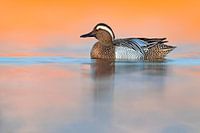 Zwemmend mannetje Zomertaling in oranjeroze gekleurd water.