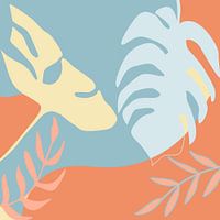 Tropische monstera palmbladeren in pastel terracotta, blauw, geel.