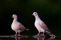 Paartje Zomertortels (Streptopelia turtur) zittend op rand van bosvijver.
