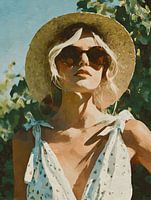 Een stijlvol zomerportret van een vrouw met zonnehoed en zonnebril, omringd door groen. De warme kleuren en schilderachtige stijl geven dit werk een elegante en ontspannen uitstraling. Tijdloos en vrouwelijk.