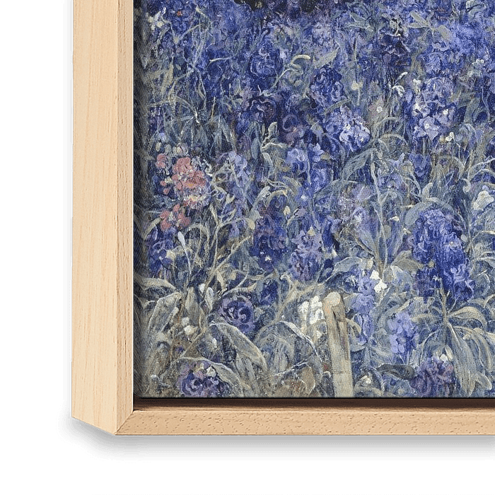 Het lijkt wel alsof Van Looy op dit grote doek met gulle hand blauwe bloemen heeft uitgestrooid. Bij langer kijken vallen het huis van de kunstenaar in Soest en de hooikarren achter de hoge heg op én rechtsvoor, tussen de bloemen, een omgevallen pot. De schilder is hier duidelijk geïnspireerd door de landschappen van Van Gogh, maar de weergave van de natuur en de lichtval zijn realistischer.