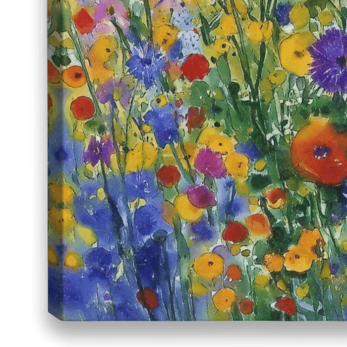 Een uitbundige mix van klaprozen, korenbloemen en margrieten in vurige rood-oranje, diepblauw en zonnig geel. Slanke stelen rijzen op uit een tapijt van frisgroen en felle bloemhoofden, waardoor een speels ritme ontstaat. De losse toets en heldere kleuren geven het werk een energieke, botanische uitstraling zonder druk te worden.…