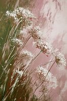 Dit schilderij vangt een vluchtig, bijna dromerig moment in de natuur: een zachte zomerwind die door een veld met wilde bloemen strijkt. Slanke groene stelen buigen licht mee met de beweging van de lucht, alsof ze samen dansen in een rustig ritme. De witte bloemschermen lijken te zweven boven het groen en vangen het licht als kleine…